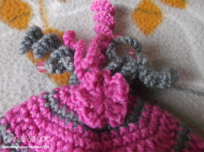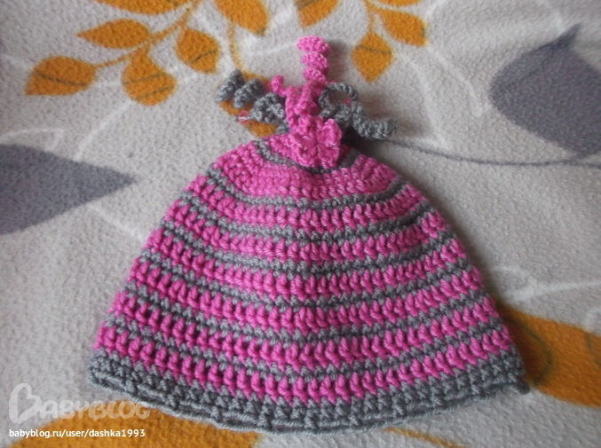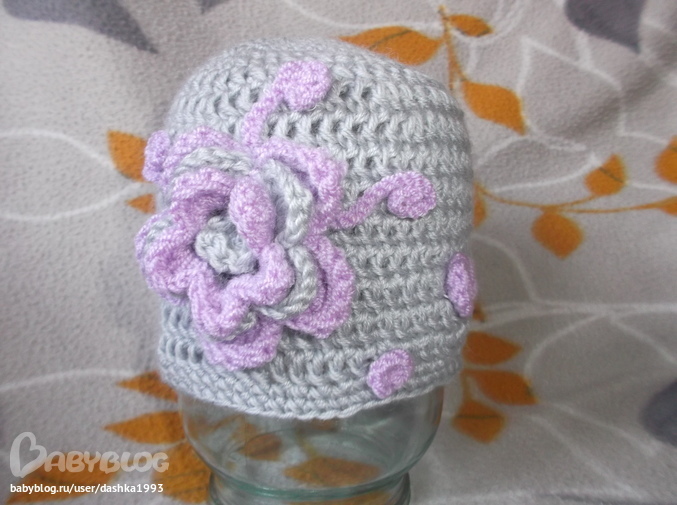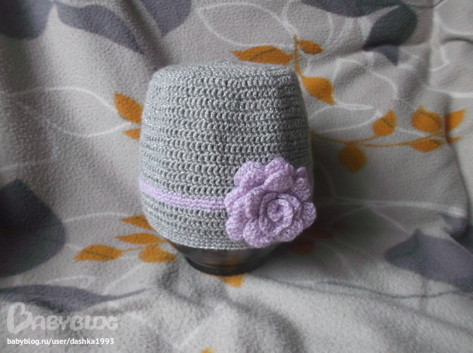 Самая малипусенькая шапочка)На 1 год, ниточки полушерсть + акрил для цветка.Шапочка очень мягонькая и тёпленькая))