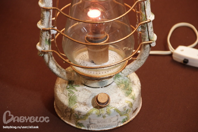 ДекупажВ этой керосиновой лампе нехватало кое-каких деталей и муж переделал ее в электрическую.Лампочку можно ставить любую. Эта служит ночником, причем не потребляет энергию)))- вот такая волшебная лампочка))) И ЕЩЕ- К СОЖАЛЕНИЮ, НА ФОТО ЦВЕТ НЕ ТАКОЙ ЯРКИЙ(((