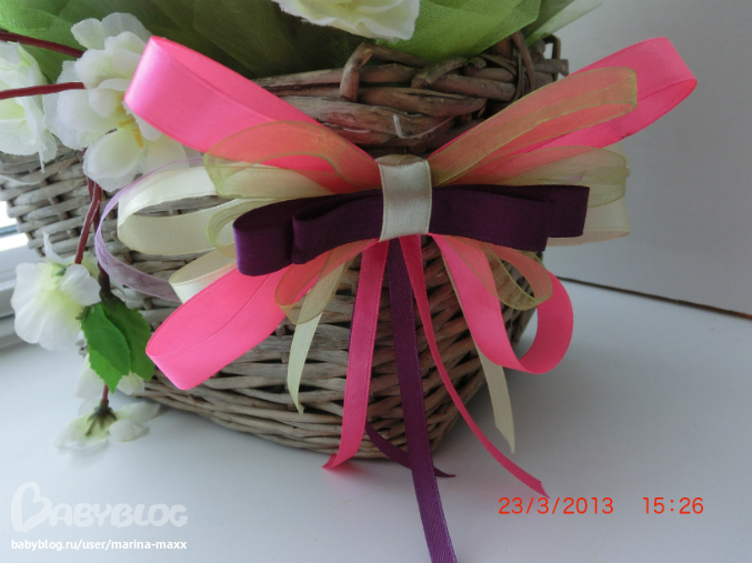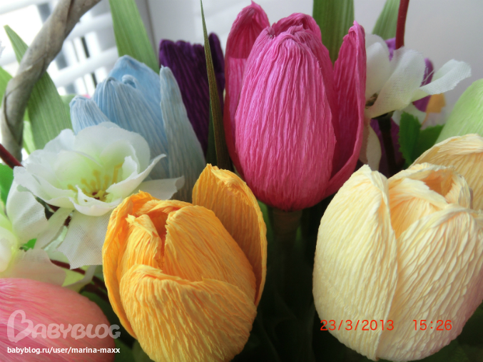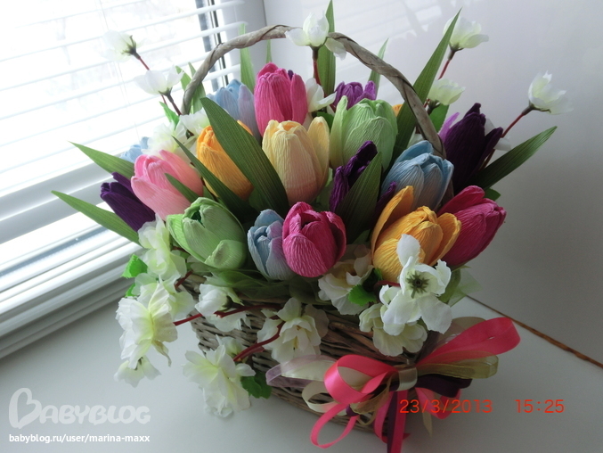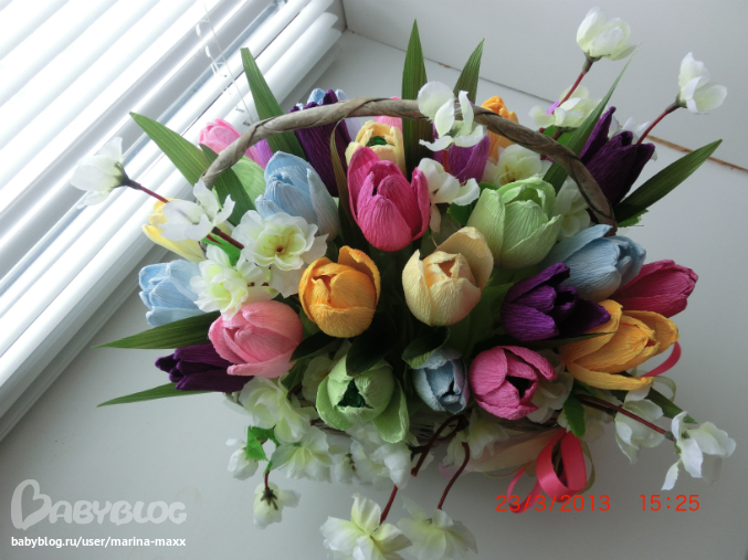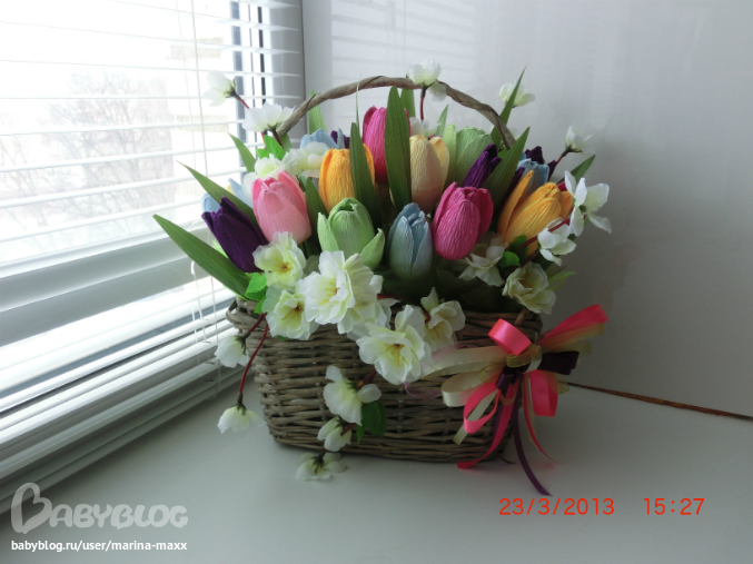 Вот решила я попробовать поучавствовать в обмене подарками к Пасхе. Честно - волнуюсь)). Долго думала, какой пасхальный букет сделать. Ну вот что в итоге получилось. Конечно, из пасхального здесь только форма цветов - тюльпаны больше всего напоминают по форме привычные нам пасхальные яички. Вот и цвета выбрала такие, в которые обычно мы их красим. Постаралась использовать разные конфеты, ведь не знаю же вкус того, кому подарю эту корзиночку. Так что там сюрприз, конфетки нескольких сортов. Девочки, что скажете, может что переделать надо? Все-таки, в первый раз делаю не своим близким и знакомым))). Время на доделку-переделку еще пока есть. Что не нравится самой - это размеры корзины. Высокая с низкой ручкой, никак не получалось соблюсти пропорцию 2\3 к 1\3. Визуально постаралась отвлечь от этого внимание это спускающимися ветками яблони. Может еще как -нибудь это можно сделать?