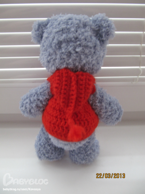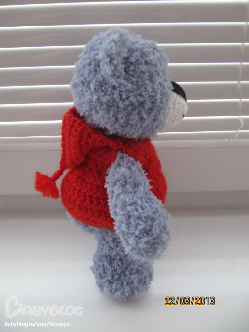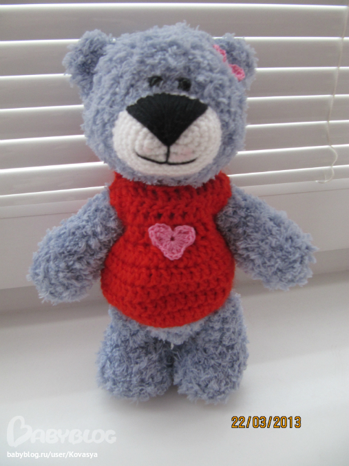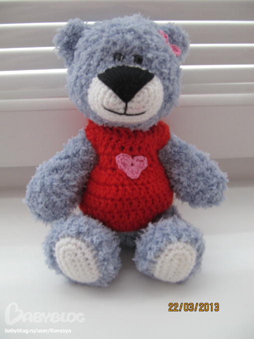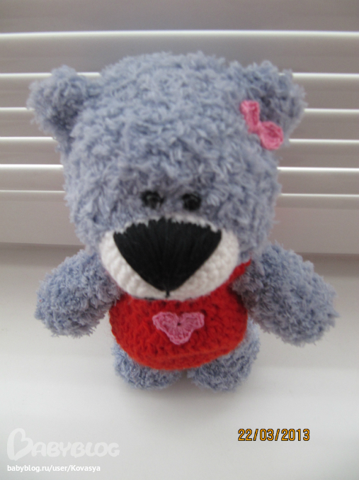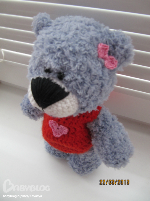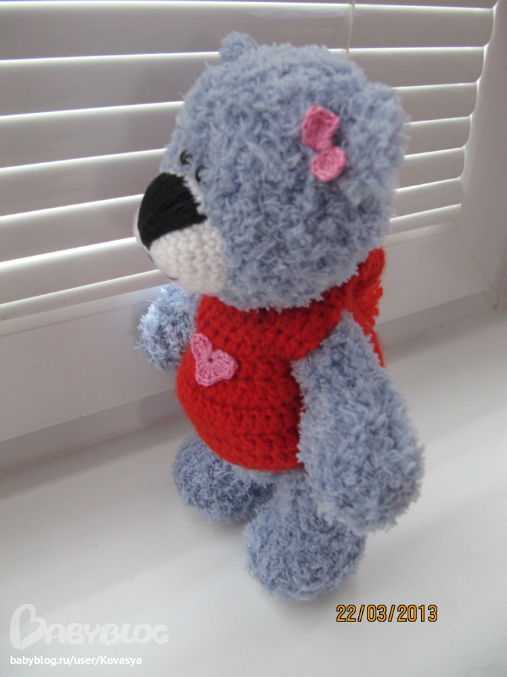 Спасибо ) Основная пряжа YarnArt Happy , а белая на ножках Nako Baby 75% акрил 25% шерсть. Во всем мишке одна набивка для игрушек, никаких вставок в ножках, и так хорошо стоит )))