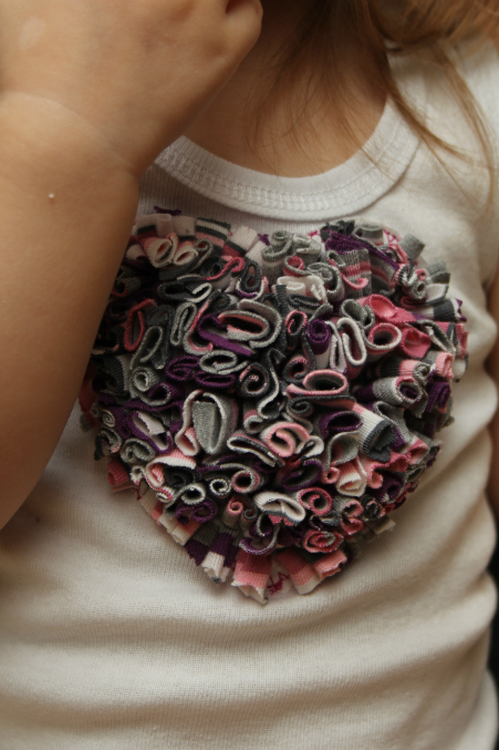За основу брала вот этот МК Но, так как флизелина дома нет, а приперло вот прям сейчас что-нить сотворить, то обошлась без него. На тонкой белой хб карандашом еле видно нарисовала сердечко, вырезала с большим запасом на края чтоб удобно было шить. Как в МК нарезала веревочек из остатков трикотажа (хотела сперва чисто фиолет, а он какой-то не закручивающийся). Пришила веревочки, обрезала, подровняла край на хб под длину ворсинок (но чтоб был запас для пришивания. По МК надо вырезать на майке сердце, вставлять с изнанки хб, только не поняла, а все нитки-строчки от пришивания ворсинок с изнанки страшно торчат? Я так не люблю. Мне нравится когда изнутри выглядит все аккуратно))) Поэтому просто приложила сверху и пристрочила какой-то фигурной строчкой хб к майке. Усё!