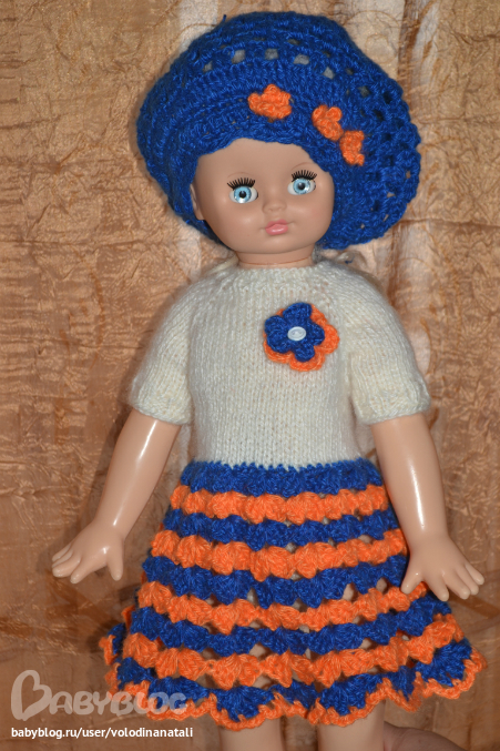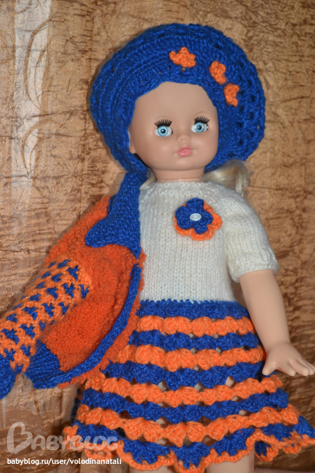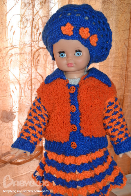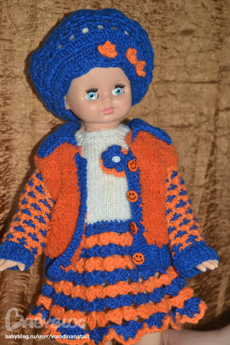 Началось всё с шапочки. Воспитатель в детском саду попросила связать кукле шапочку на завазках. Связала. А потом сказали, что нужно и без завязок, а заодно и платье и ещё что-нибудь. Вот что получилось. Вязание комбинированное: берет крючком, курточка спицами, а платье комбинированное.