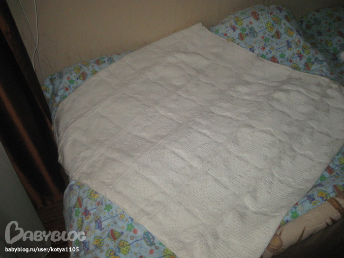 Наберите 150 п. и вяжите 4 ряда узором «рис». Далее распределите петли следующим образом: 1 п. кром., 4 п. узора «рис», 32 п. схемы «Мишка» лиц. гладью, 4 п. узора «рис», 32 п. схемы «Мишка» изн. гладью, 4 п. узора «рис», 32 п. схемы «Мишка» лиц. гладью, 4 п. узора «рис», 32 п. схемы «Мишка» изн. гладью, 1 п. кром. Таким образом свяжите в высоту 3 схемы «Мишка», провязывая между ними по 4 ряда узора «рис». Петли закройте и обвяжите плед по периметру одним рядом ст. б/н.