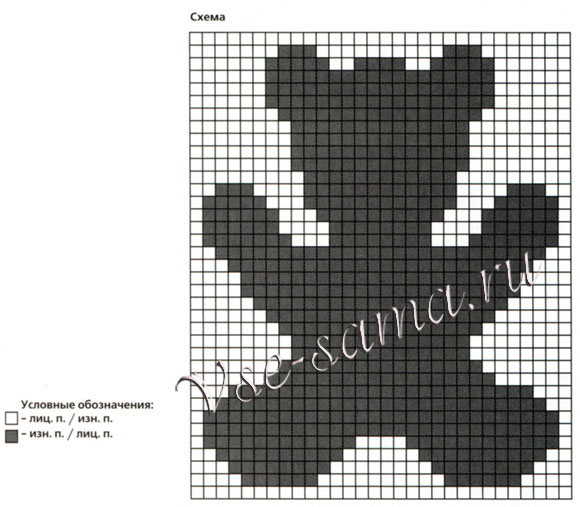 Мотив «Мишка»: вяжите по схеме, чередуя изн. гладь на фоне лиц. п. и лиц. гладь на фоне изн. п.