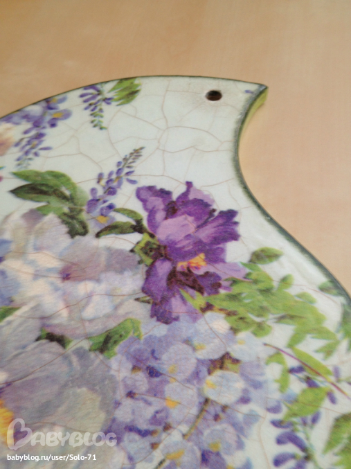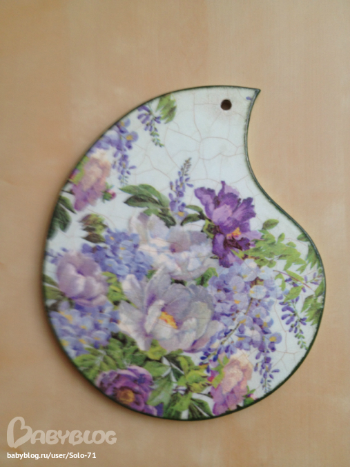 Декоративная досочка "Акварильный букет в сиреневых тонах", на ней если присмотреться можно увидеть один странный момент в кракелюре, после того как смоешь второй слой и изделие высыхает появляется множество мельчайших трещинок и если покрыть изделие акриловым лаком в один слой, то эти микротрещинки можно затереть и проявятся мельчайшие трещенки. Это со всеми кракелюрами так?