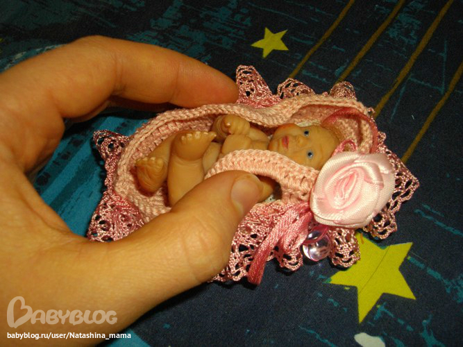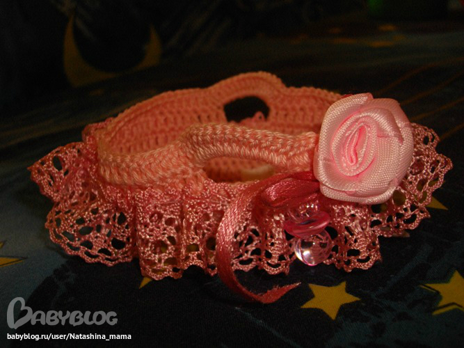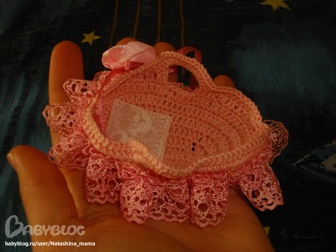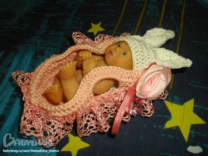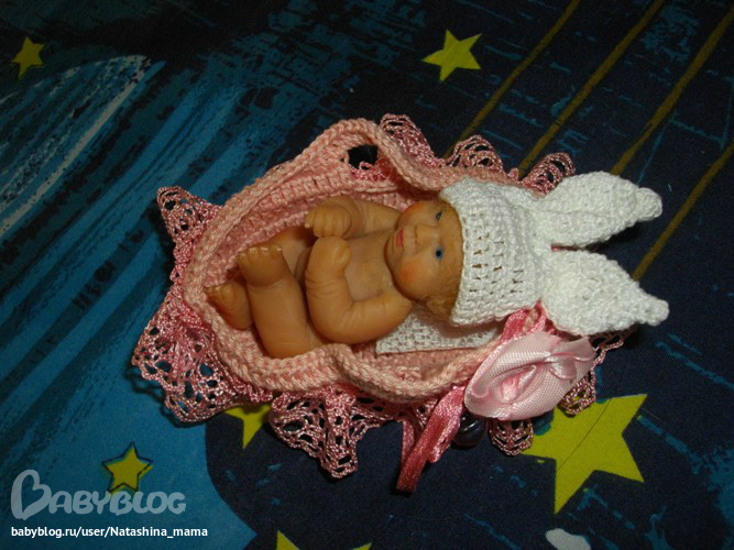 Люлечку вязала из хлопка, украсила кружевами, цветочком из атласа и стеклянной розовой соской-пустышкой, шапочка тоже из хлопка.