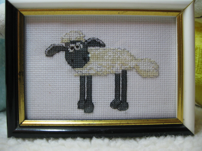 Сегодня хочу показать одну небольшую работу - милого мультипликационного героя барашка Шона. Моя дочка очень любит этот мультик и называет его почему-то "зе пип зе Сон" (Shaun the Sheeps). Так смешно звучит в ее 2,4 года:) Вышился за один присест в очереди к стоматологу. Есть у нас один очень хороший стоматолог и к нему всегда большая очередь. Я впервые взяла вышивку в общественное место. До этого вышивала только в поезде. Зато 2 часа в очереди не прошли зря:))