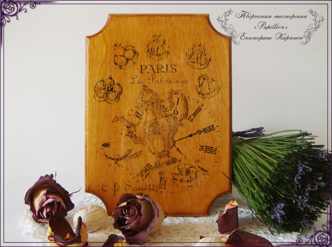 1. Панно: покрыто водной морилкой, лаком, приклеена распечатка лицом вниз, скатаны лишние слои, и еще несколько слоев лака