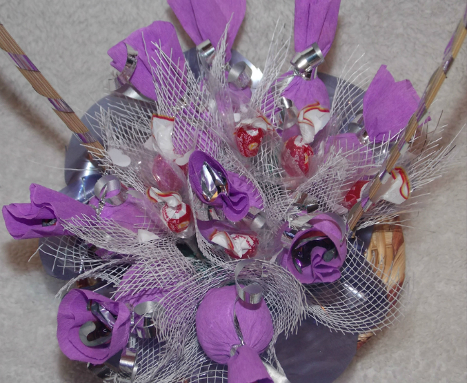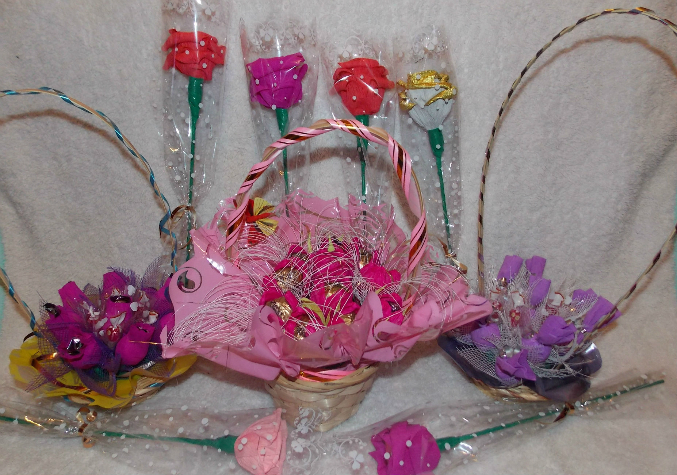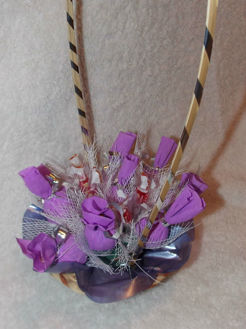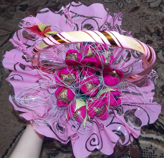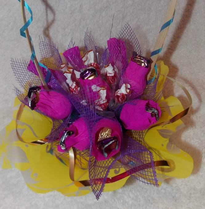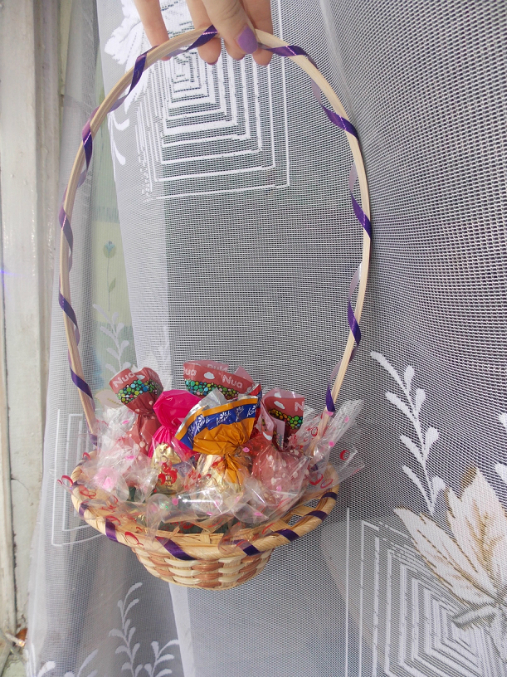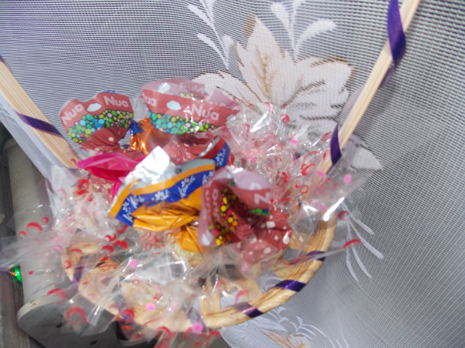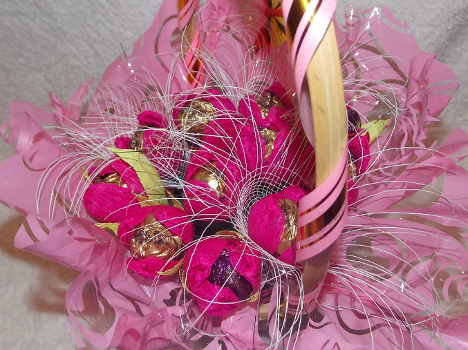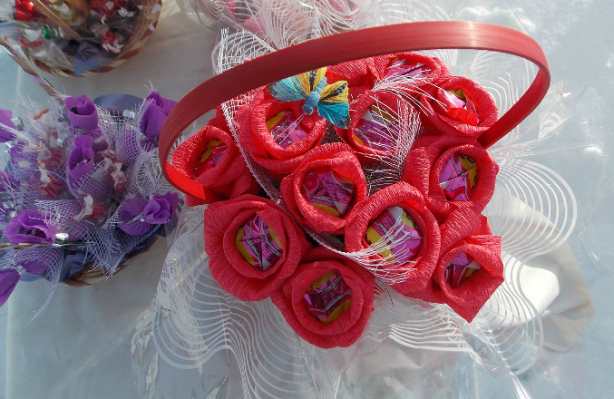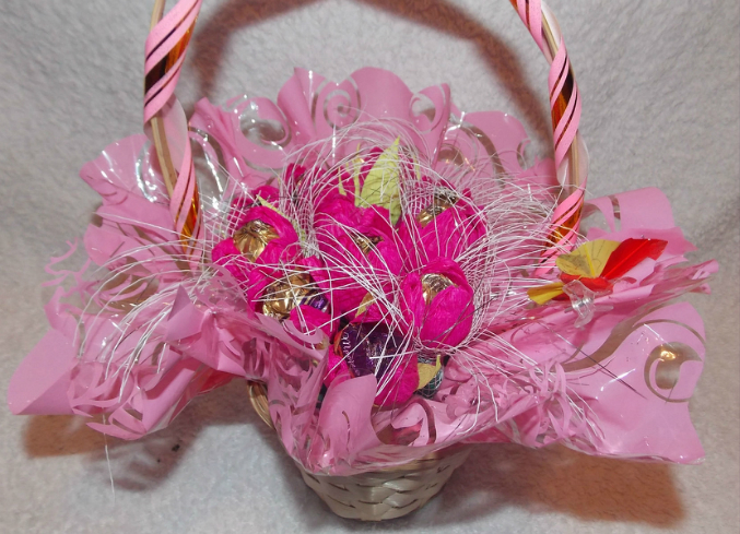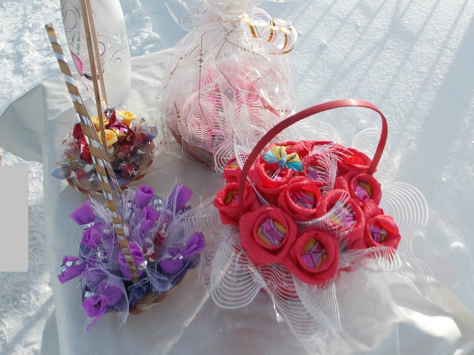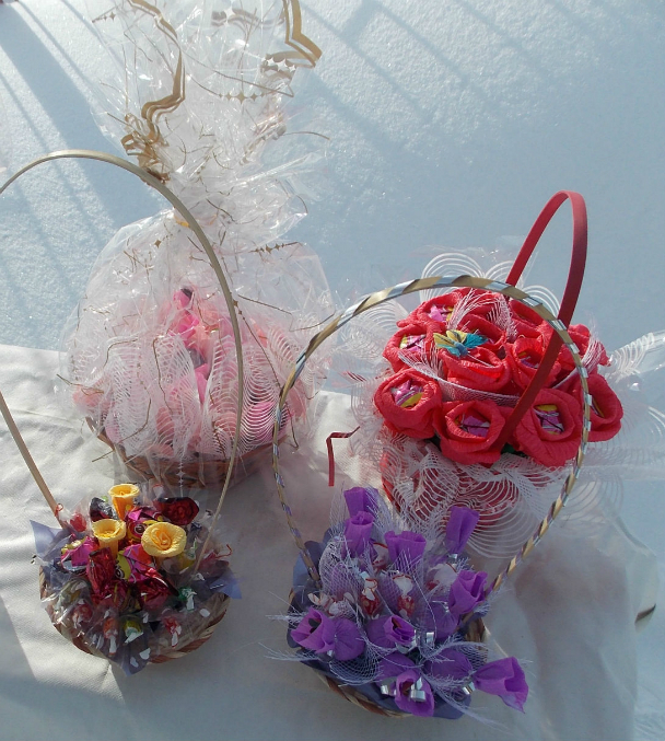 Первая работа - как будто в корзинку просто положили конфеты. Остальные - немного лучше ) Не оборачивайте корзины в упаковочную бумагу - используйте лучше сетку - смотрится дороже )