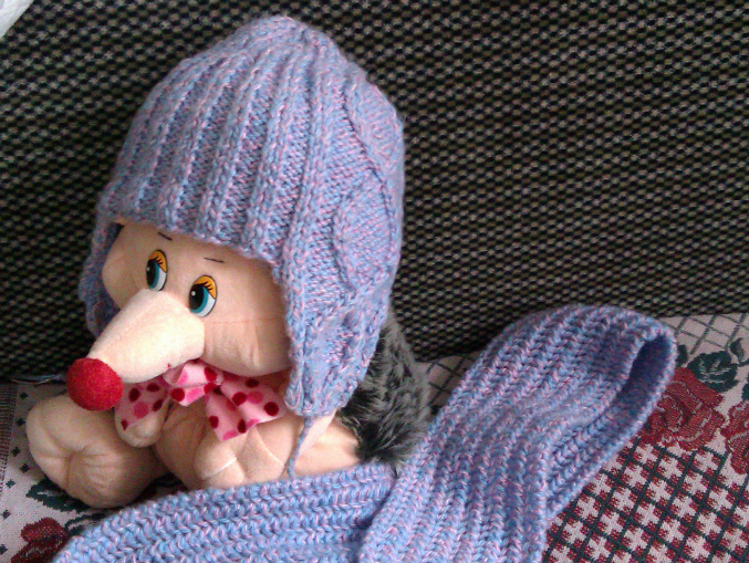 Она очень удобная, закрывает лобик, ушки, что немаловажно при наших ветрах))) А шарфик уже потом довазался "английской резинкой"))) Носим мы ее с 5 месяцев (сейчас нам почти 10).