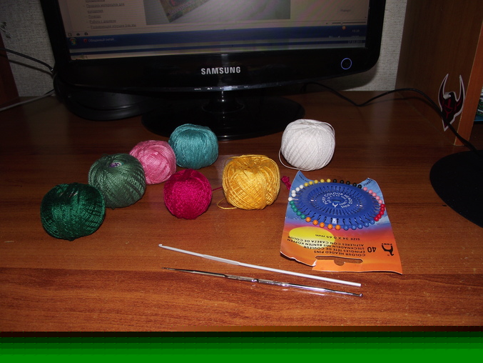 1. нитки зеленого цвета 3-х оттенков, белого, ярко желтого, малинового и темно красного.