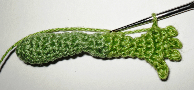 При присоединении пальчиков к ладошке соединительным столбиком, захватываем обе стенки ладошки, чтобы ее соединить. Хвостик прячем внутрь ладошки с помощью крючка.
