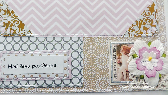 Ну и последний разворот: "мой день рождения" и конвертик для всяких нужностей (туда я вставила тег с двумя фотографиями, тег с достижениями малышки и схемку прорезывания зубов, кроме того здесь же расположен конвертик для первого локона малышки, это так трогательно когда его сохраняют... )