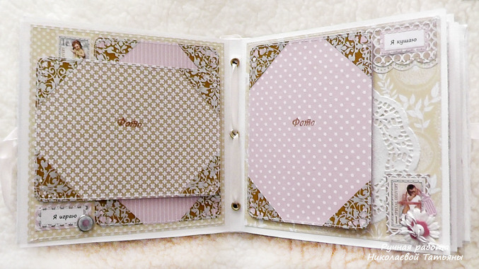 страничка с первым фото малышки, фото открывается, а внутри место куда запишут ее данные при рождении, а также свободное место для коментариев Аришкиной мамы ))))))):