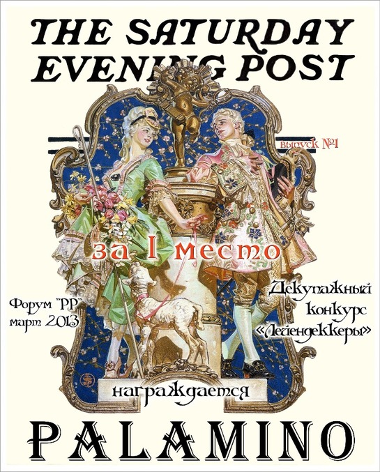 ) на форуме "Ручной Работы" в декупажном конкурсе "Лейендеккеры" ( в работе можно было использовать только изображения братьев иллюстраторов - Джозефа Кристиана Лейендекера и Фрэнка Ксавье Лейендекера)