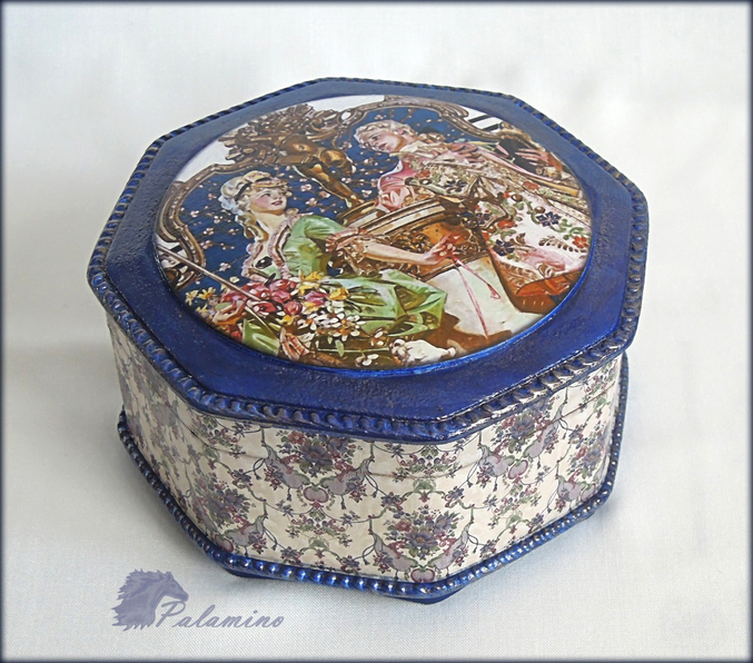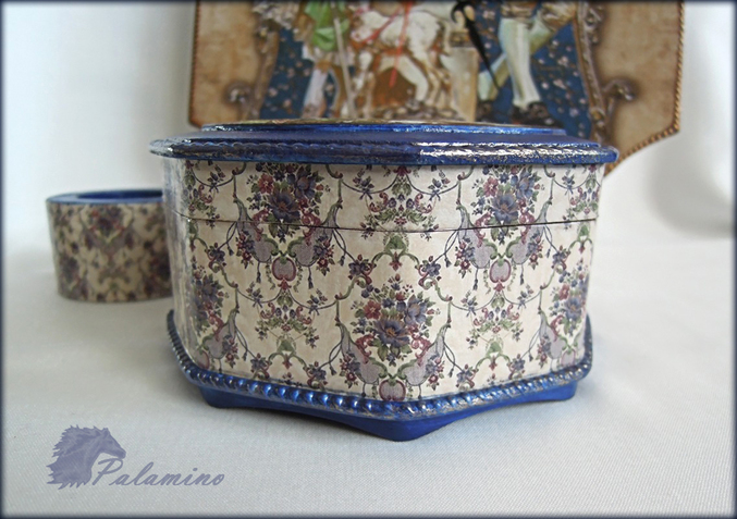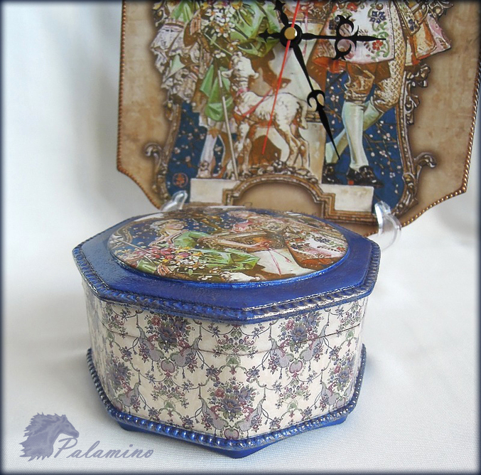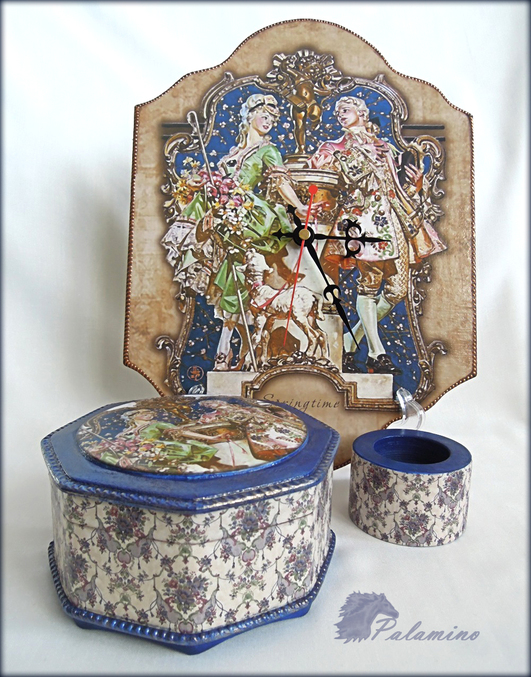 Материалы и техники: заготовка под часы 21 * 29 см, шкатулка мдф, заготовка подсвечника. Лаковые распечатки, клей для декупажа, контур декола белый для создания рельефа по краю крышки шкатулки и нижней фаски (шел под покраску), бронзовый контур на часах (немного приглушен медиумом яблочно-коричневым, Plaid), краска Plaid«морской синий», Ладога Ультрамарин, на крышке шкатулке и по рельефу лессировка мокрой кистью «золото сусальное», Ладога, старение вышеупомянутым медиумом, лак Поли-р.