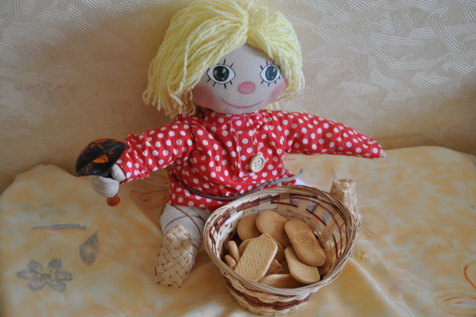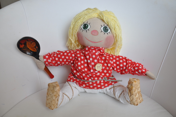 весь в фольклорном стиле! с расписной ложкой, в настоящих(!) лаптях! у Кузи прекрасный аппетит)) увы, съестные припасы дома заканчиваются (приближается конец недели). поэтому у него в корзинке пока печеньки Бонди))