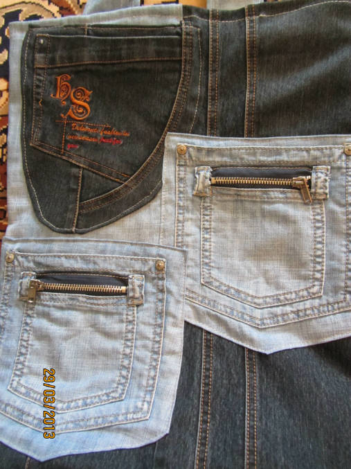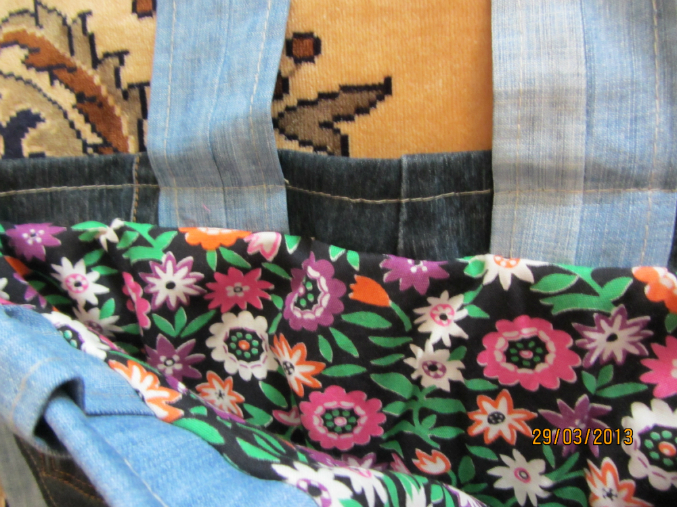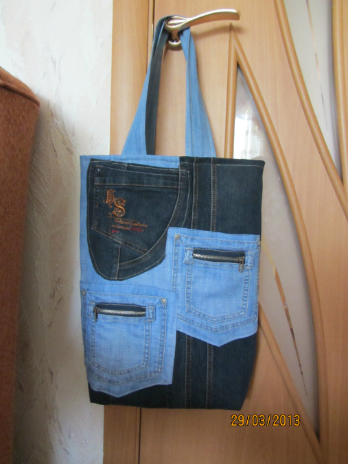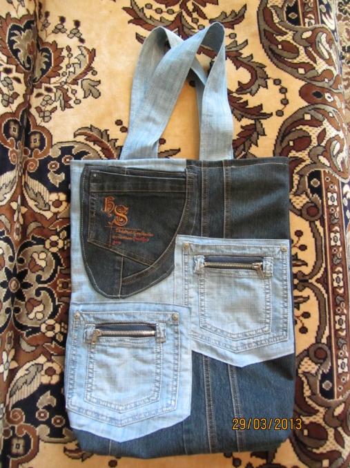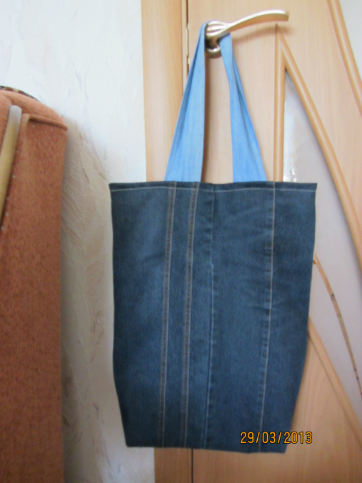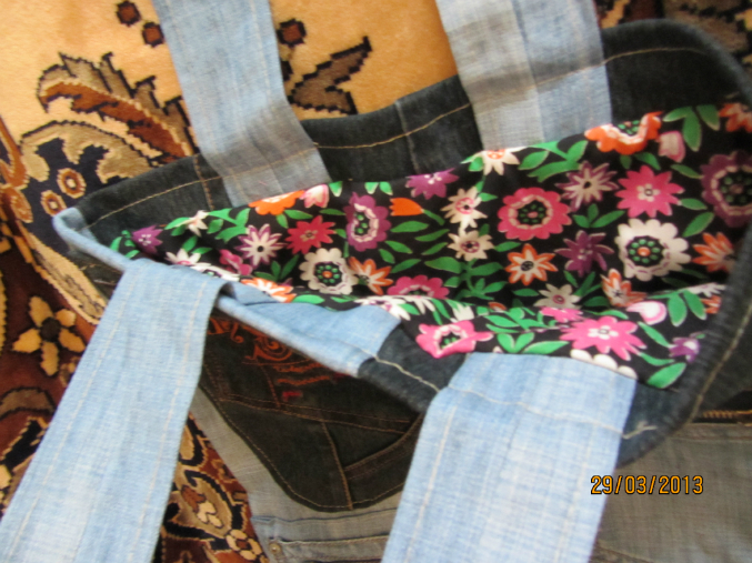 Вчера девочки натолкнули на идею шитья сумки для прогулок с ребенком из старых джинс....Так вот,я сразу поперла в шкаф и нарыла 2-е старых,маленьких и подтертых джинсиков ....Сшилась вот такая сумка с яркой подкладкой (что дома было)...Но наверное с ней стыдно будет на улицу выйти....Девочки,нужно ваше мнение!Я очень старалсь,но все равно швы пляшут местами...В общем,судите сами.