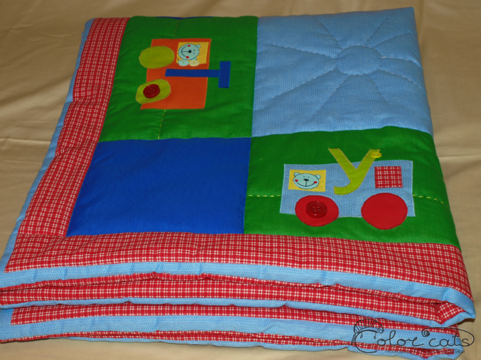 Екатерина, это все-таки покрывалко на кроватку, да и малыш уже достаточно большой, чтоб ползать по нему. Скорее он будет рассматривать паровозик и буквы каждый раз, как подходить к своей кроватке или просто играя рядом. Ну и укрываться им перед сном.