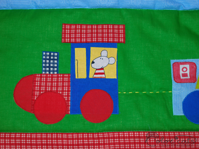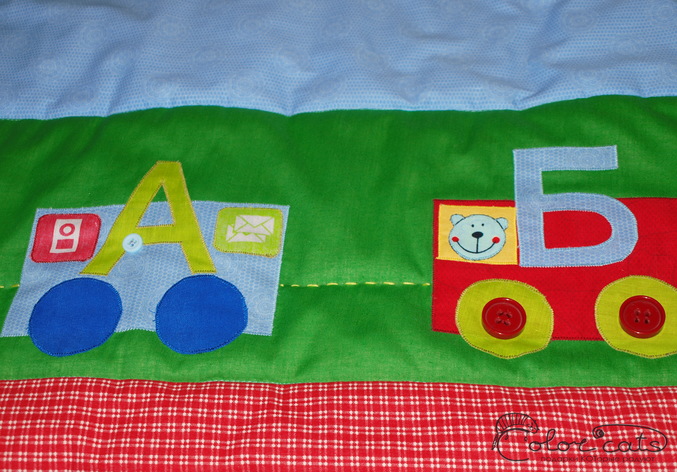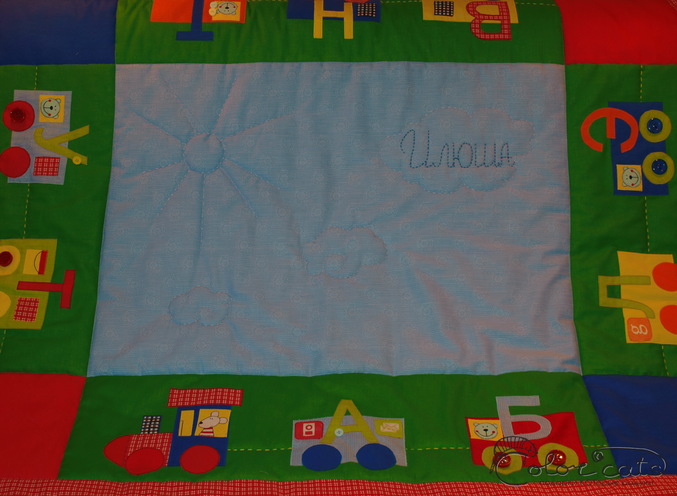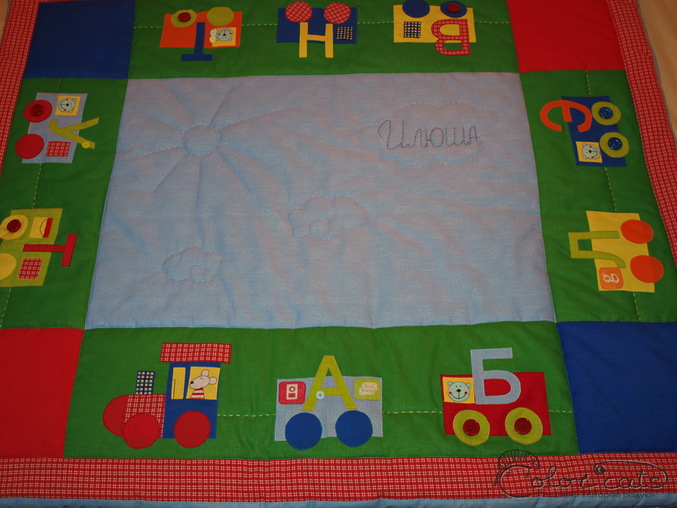 Анна сказала, что Илюшкин любит паровозы (а какой мальчик их не любит) и еще буквы разные) Вот мы и решили все это совместить. Размеры 120*140, внутри синтепон.