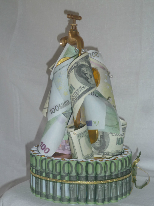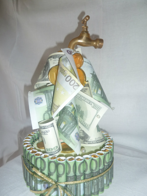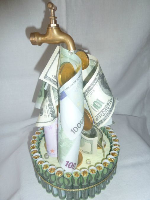 Этот агрегат я увидела где-то на просторах интернета, но по случаю вспомнила и воплотила в жизнь. Его подарили на юбилей мужчине. Как потом рассказавыли - юбиляр был в восторге, гости и кран пробовали крутить, и ладони подставляли, и просили на ночку в личное пользование. Мне изготовление этого крана доставило много удовольствия - какой-то очень позитивный и весёлый подарок получался. Ну, вот собственно и он: