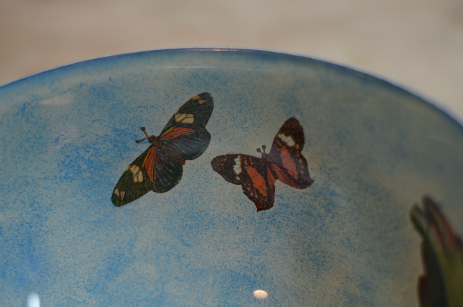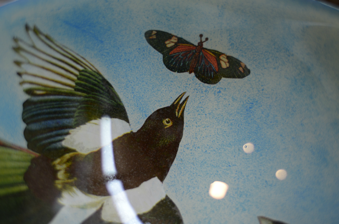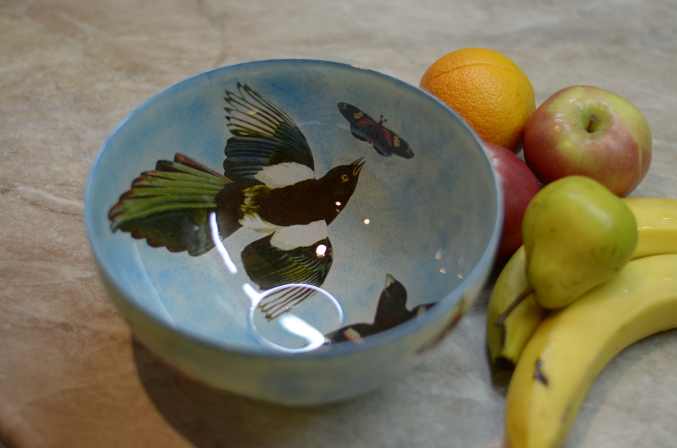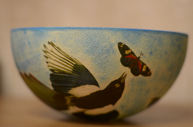 Урок четвертый: "Небесная охота". Обратный декупаж на прозрачном салатнике. Вся работа сделана снаружи, так что внутри - только стекло и можно пользоваться, что я и собираюсь делать.