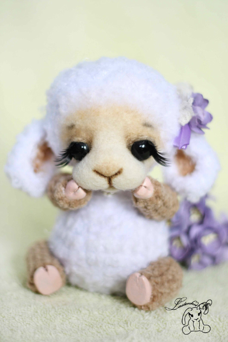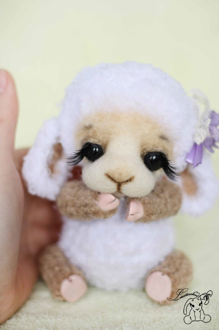 Связана малышка из фактурной пряжи, копытца из пластики. Мордочка фильц. Лапки и голова на шплинтах. В попе гранулят. Росточек 13см. Стоять не умеет. Тонирована маслом.