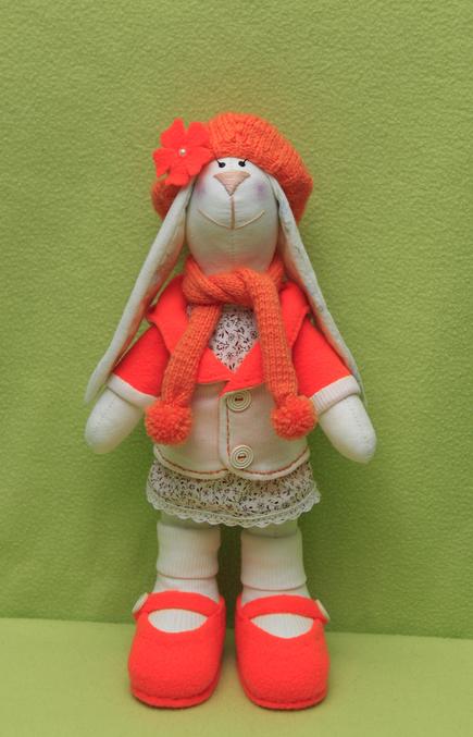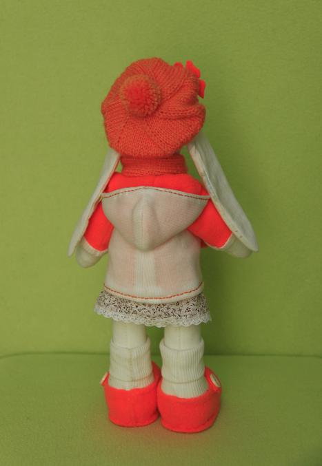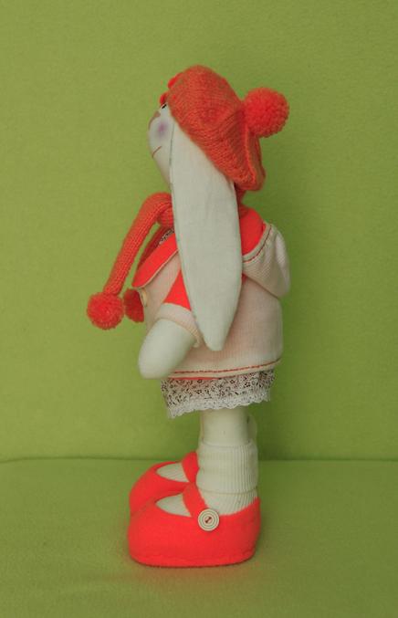 Это моя первая Зая. И, можно сказать, что это первая швейная работа. До этого никогда не шила. Высота игрушки -37 см. Умеет самостоятельно стоять, сидеть. Передние и задние лапы на пуговичном креплении.