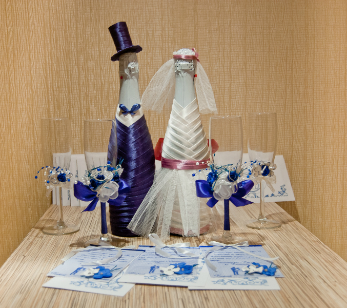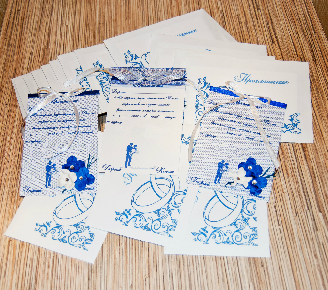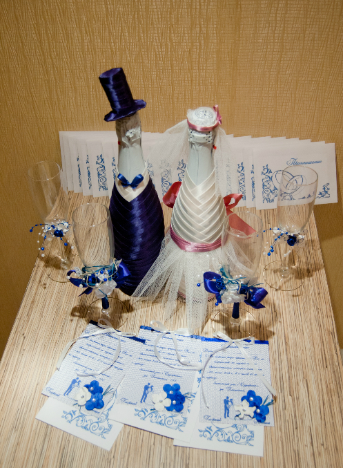 СкрапбукингВ общем заказали мне пригласительные на свадьбу в бело-синем цвете. Ну там и у жениха костюм синий и оформление такое. Потом попросили попробовать сделать бокалы и бутылки. Ну и ещё книгу для пожеланий. Книга ещё в работе, а вот остальное уже отдали заказчикам.