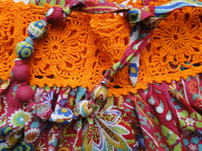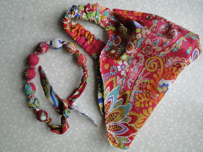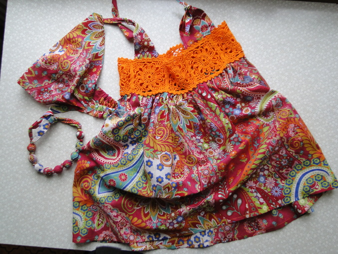 Подсела я на комбинированные платья))) Решила дочке подруги сшить сарафанчик, да увлеклась... Ткани купила метр, рассчитывала на 2 платьишка (хотела еще доче такое же), но потом в комплект пошилась косыночка и бусики на ум пришли, так что моей не хватит(((. Ну, я на этом не остановлюсь, что-нибудь придумаю))) Зато крестница мужа будет модница на все 100%.