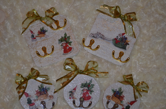 ДекупажДевочки, не кидайте тапочками, НГ давно прошел, но руки никак не доходили похвастаться) А тут увидела фото и решила выставить на Ваш суд)) Фанерку рисовал сынок, вырезал вместе с папой, шкурил тоже все сын ( с таким трудолюбием и упорством, что думала протрет насквозь)), грунтовал тоже Паша, салфеточки клеяли вместе)) красили и покрывали блестками тоже вместе (но не потому, что он не справился бы, а потому, что мне тоже безумно хотелось поучаствовать в этом процессе), ну и наконец, ленточки привязала я)))) Паша с огромным удовольствием поздравил родственников, учителей и друзей такими самодельными ключницами))