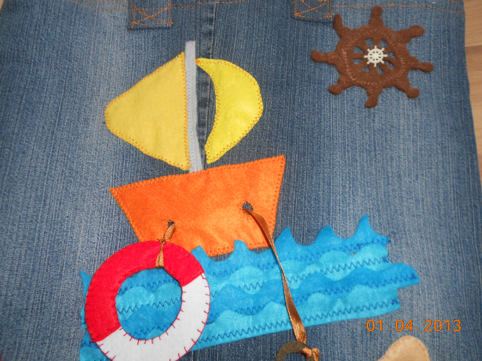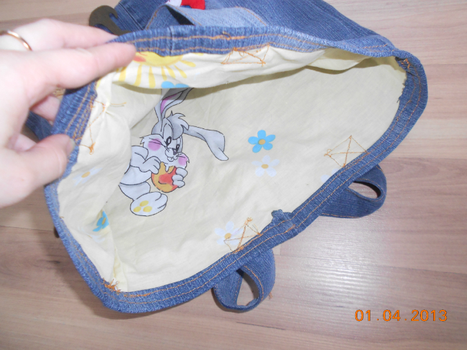 сшилась из старых моих джинсов , апликация из фетра, удобненькая , сама опробовала ..... теперь вот думаю сшить такую же себе только с другой аппликацией, летом очень пригодится для прогулок с детьми -бутылочки, соки, платочки....все туда как раз поместится!