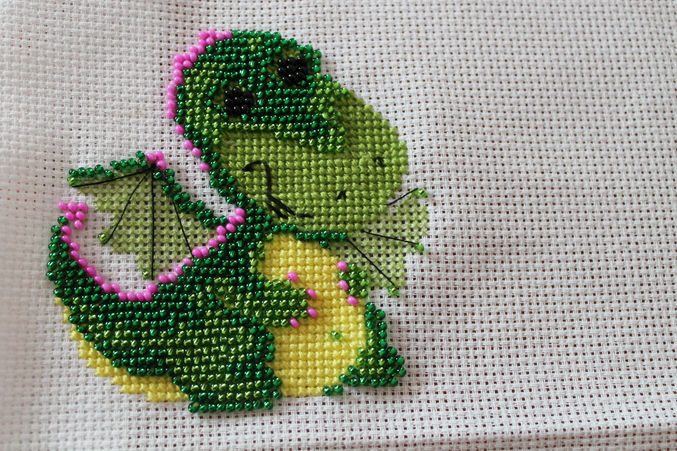 Вот и готова моя первая работа! Сначала замахнулась на большую картину, но все таки решила сначала попробовать вышить маленькую, так как никогда ни крестиком, ни биссером не вышивала. Вышивала для сынули дракончика. Так как он родился в год дракона. Техника смешанная биссер+крестом. Вот что получилось.))