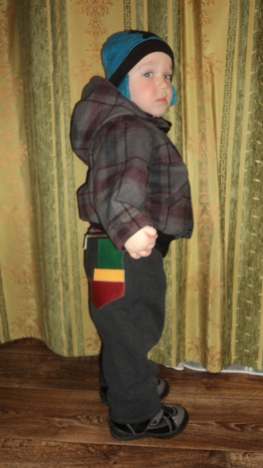 Шитье одежды, выкройки, ремонт одежды, шторы, швейные машины (уже приобретенные)были у нас папины брюки- АРМАНИ. Стали сына.. Небольшой экперимент с большими (больше чем обычные) карманами на попе. Ткань на флисе, на карманах натуральная кожа, наклейка трансфер, и остатки от моей рубашки на отворотах. Строила сама.