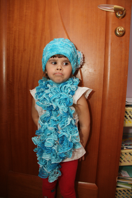 вот!)))Купила себе на шарфик еще будучи беременяшкой Дантелу, но что-то все никак. Потом - некогда стало. Случайно прикупила по цвету акрила пару мотков детского. А потом мне жутко надоело ждать весну, захотелось как-то ее поторопить! Я даже заказала детям костюмы-непромокашки мембранные на дождь. А шапочек свеженьких нету. Вот тут и захотелось снова повязать (хотя я вяжу обычно в беременном состоянии в основном, вдруг, что ли опять... ой-ой, рановато) вобщем, первый комплектик готов! Единственное, меня смущает, шарфик выдержит ли проверку детством? а точнее - детским садом? и еще. Дочка средняя сказала, что так нечестно, Наташка маленькая, а ей такой комплектик. Давай и мне, только зелененький!!!
