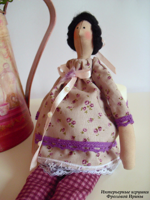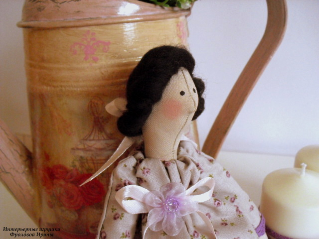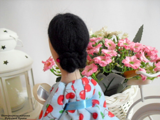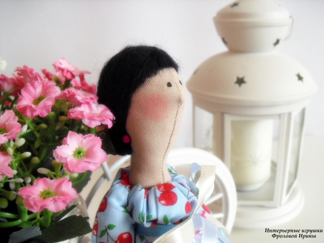 Использовала габардин, хлопок, кружево разное и декоративные элементы, волосы - шерсть для валяния.