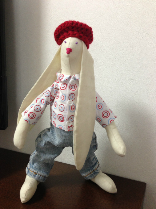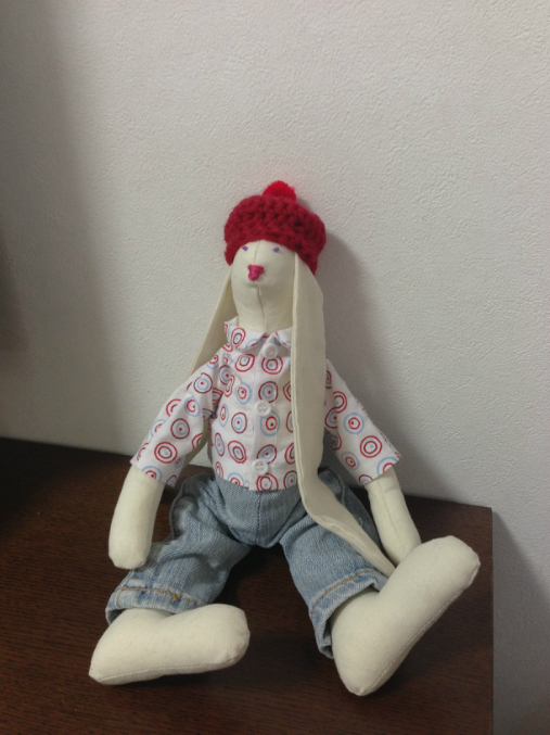 был сшит на обмен подарками, который, видимо, уже и не состоится. Ждал отправки 2 месяца, пока остается у меня дома, а там подумаю, может уедет к кому-нибудь жить. Шила из набора, что заказывала у девочки. Зайку мне шить очень понравилось, но! в наборе была джинсовая ткань для брючек и беретки, ткань была просто ужасная, она вся сыпалась, измучалась вся с ней, в результате выкинула, а штанцы сшила сама из своих старых джинсов, а беретик связала.