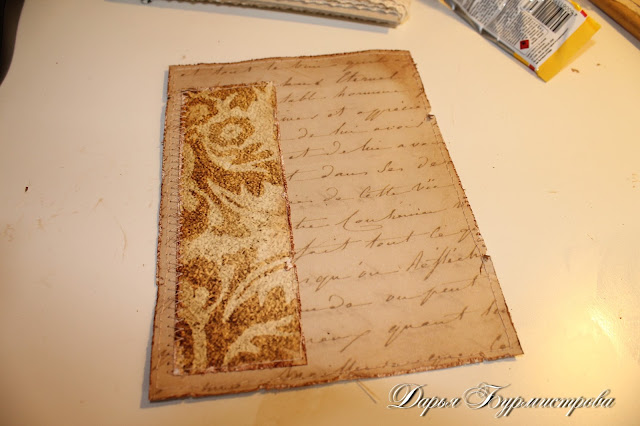 Фоновую бумагу прострочила по периметру на машинке. Далее внимание-приступаем к работе по скетчу.Поскольку две узкие вертикальные полоски у нас идут как фон-мы с них и начинаем.В качестве этих элементов я выбрала отрезок бумаги с винтажным рисунком,подходящим по цвету ко всей композиции.Также обтрепала край и прострочила на машинке.В качестве второго элемента я взяла хлопковое кружево-обратите внимание как расположены элементы на скетче и на моей открытке-один чуть ниже,другой внахлест и выше.Кружево также затонировала и потрепала концы.