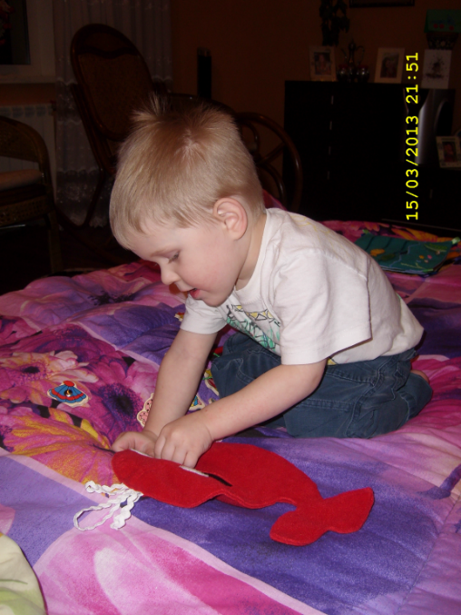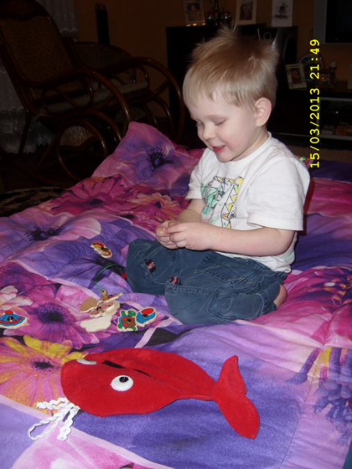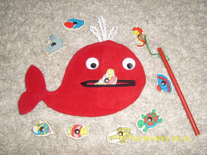 Но пока шила "морскую" страничку в подарок малышу (там тоже кит есть, но другой), Гера сказал, что ему очень нужен Кит и я ему предложила Кита-обжору, он ему еще на картинке понравился, а уж как он с ним подолгу играет и когда в гости идем с собой берет! Нам даже удочка по размеру подошла (если в хвостик засунуть)