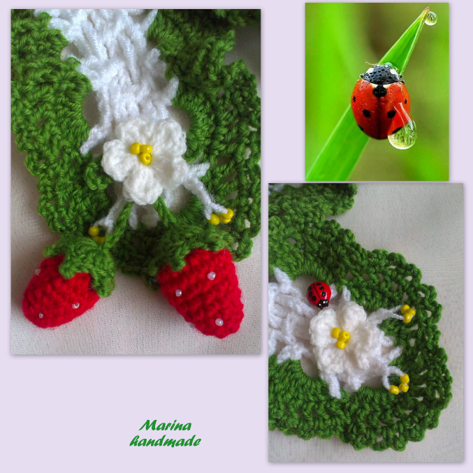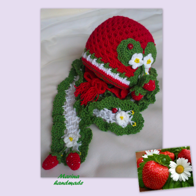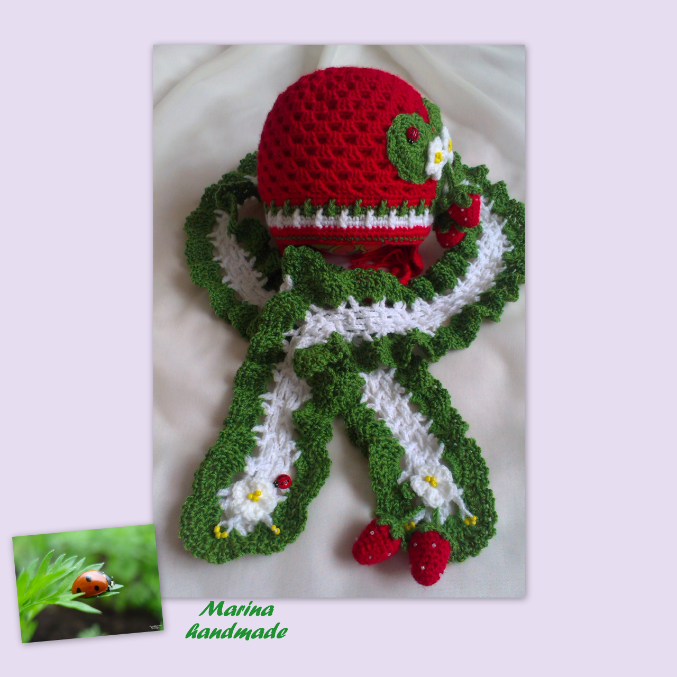 Люблю я эти шапулечки, хотя и красный цвет для меня самой не особо близок. Очень нравится вывязывать эти аппетитные ягодки, прекрасные цветочки, божьих коровок тоже очень уважаю. Но всё никак для своей красавицы не сотворю это чудо, а этот комплектик уедет к почти годовалой малышке в Приморский край.