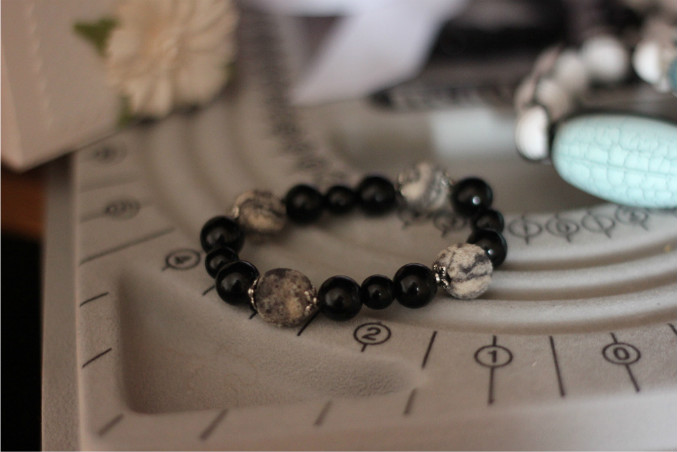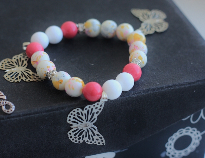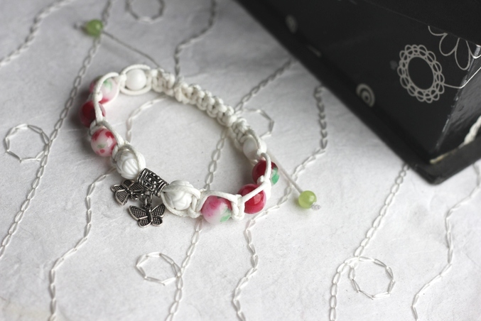 браслет в малиново-мятных тонах с феей и бабочками - натуральные камни турмалин, майорка, оникс, розовый кварц с серебрянй фурнитурой