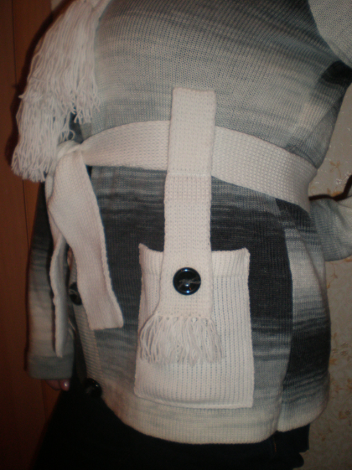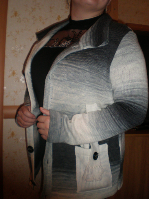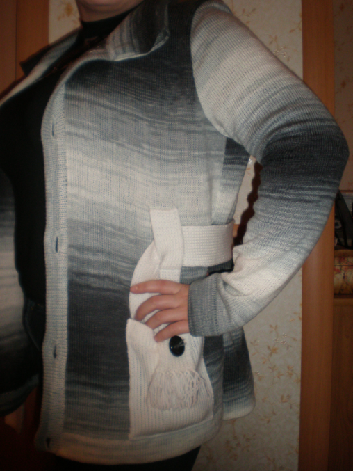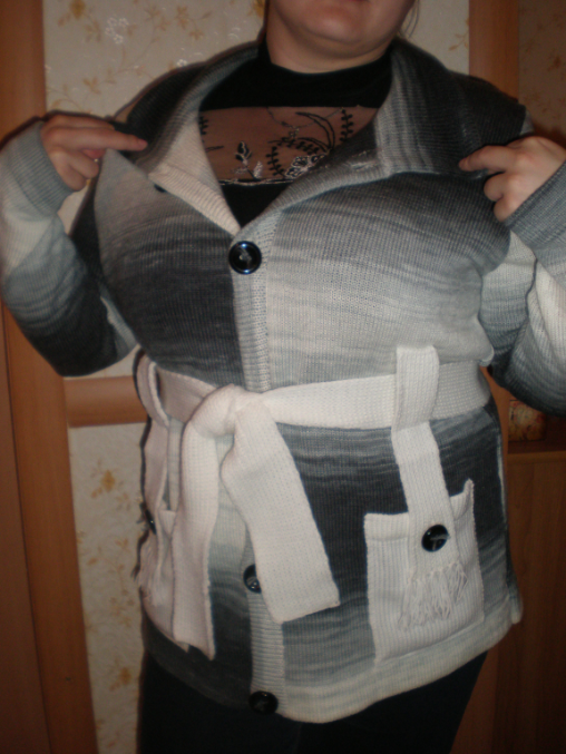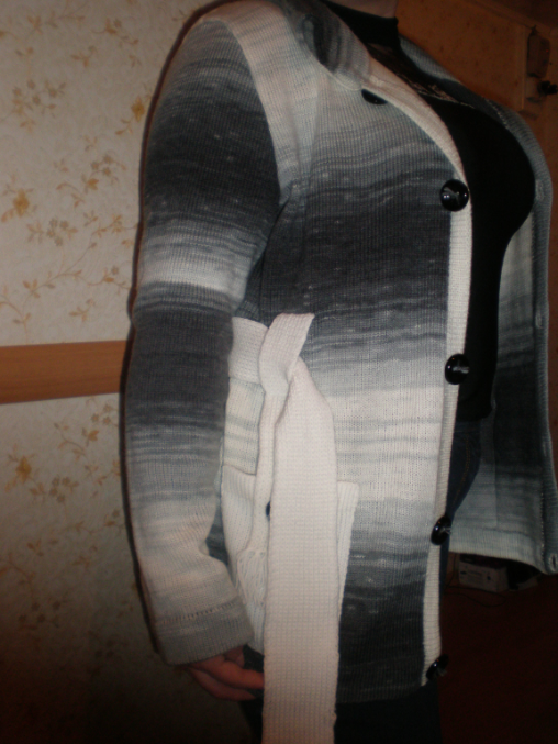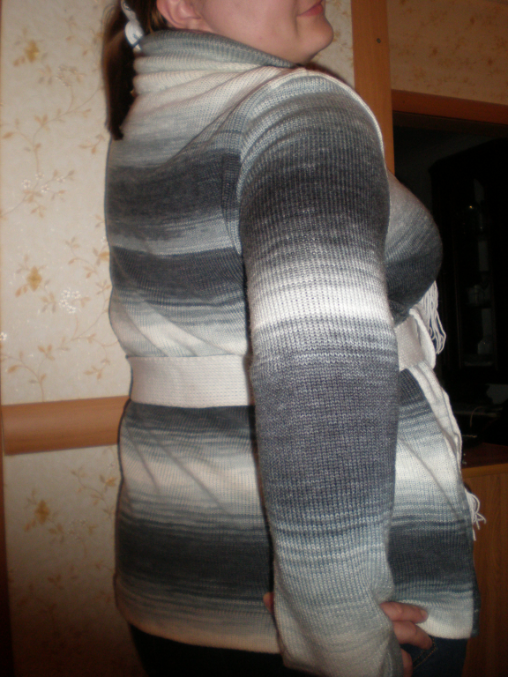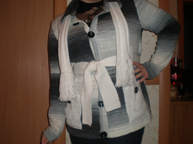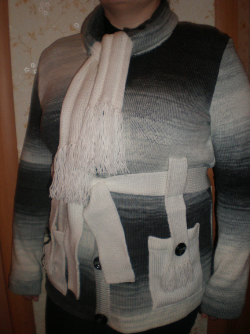 Мне нравится почти все, НО пояс считаю лишним(считаю он Вас полнит). Либо пояс должен быть черным, хотя и тогда мне кажется он будет лишним смотреться. А вообще мне Очень нравится. Обажаю простые и элегантные вещи. Расцветка замечательная, пуговицы "в тему", связан аккуратно, на совесть. Супер короче