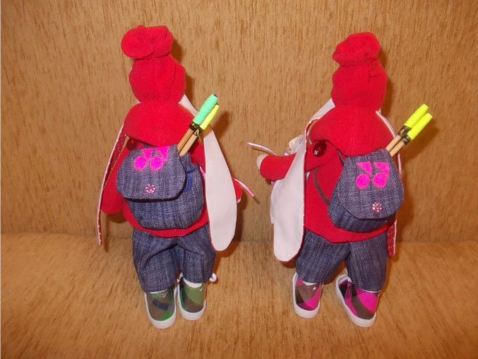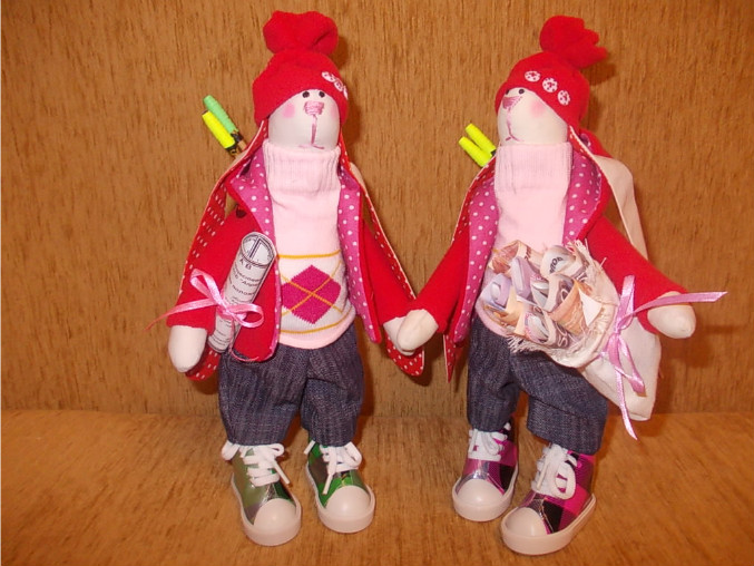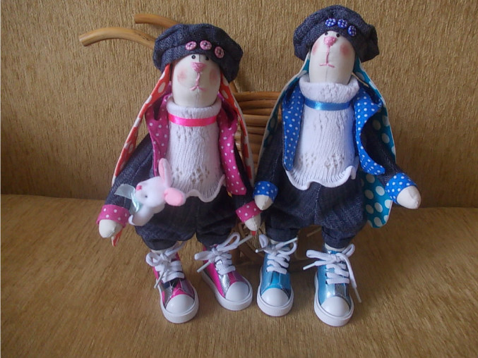 Джинсовых зайчиков шила, как мальчика с девочкой, а их приняли за девочек обоих, и ушли жить в разные семьи. А зайчиков в красных куртках шила на заказ, клубу бадминтонистов, просили в красных куртках и шапках, у одной устав в руке (председателя клуба), а у другой мешок с деньгами (кассой заведует), их уже подарили хозяйкам, говорят понравились очень)
