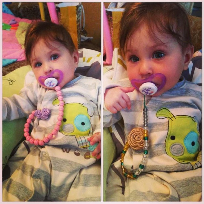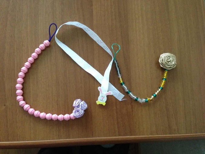 Решила немного порукодельничать)) Дочка любит пустышки выплевывать,чтоб мама бегала и поднимала по команде "Апорт!"))))Я решила сделать держатели для соски..аж целых три! Выставляю на Ваш суд))Фото в комментах,так как в пост не получается уже который день загрузить((((((
