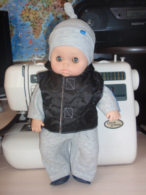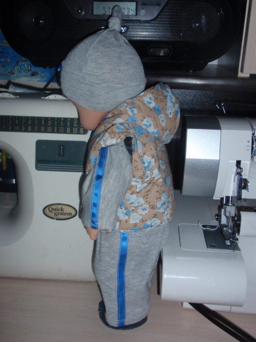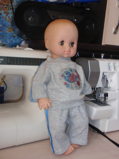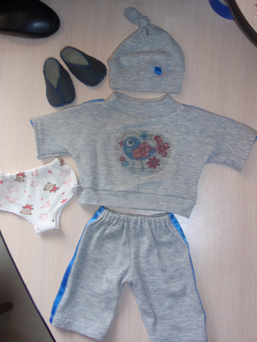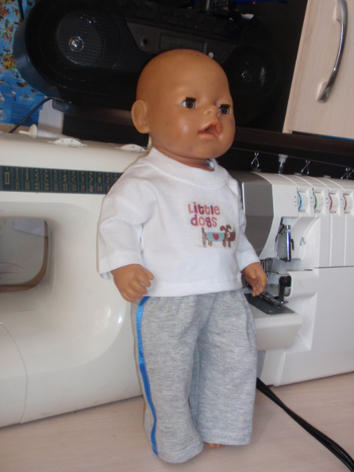 Потом сшился костюмчик для него и нашего бэбика. Наш правда чумазый уже весь. Шила из трикотажа доставшегося от свекрови .Бэбису кофточку перешивала из младенческой футболки, термотрансферы делала сама, с помощью термотрансферной бумаги, для кукольной одежки сойдет, для детской полная фигня, поэтому лучше купить готовую.