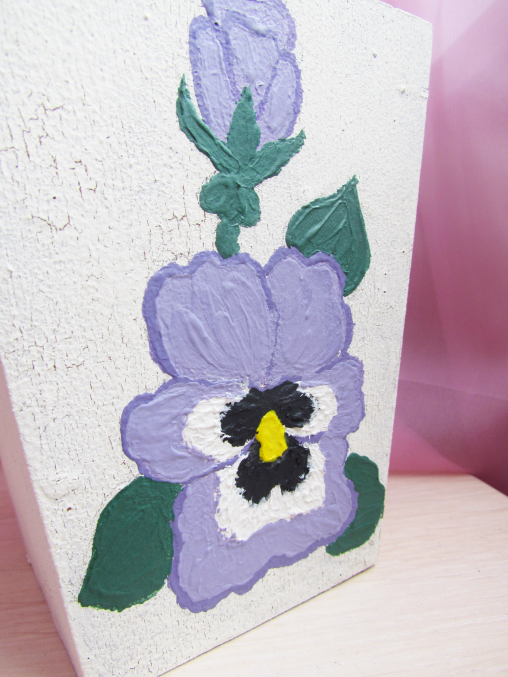 Основа горшочка-дерево. Покрывала несколькими слоями краски для получения желаемого эффекта. Анютины глазки рисовала текстурной пастой с добавлением акриловых красок. Лепесточки из фетра.