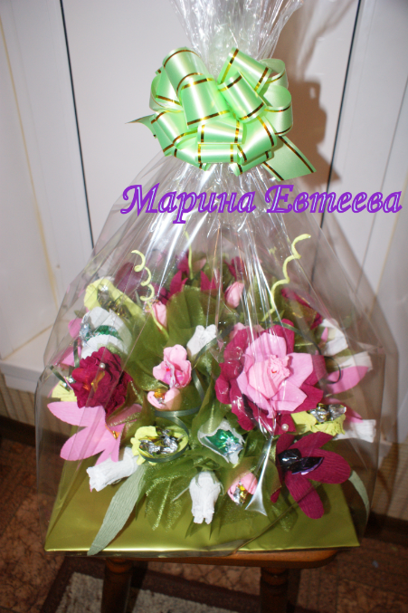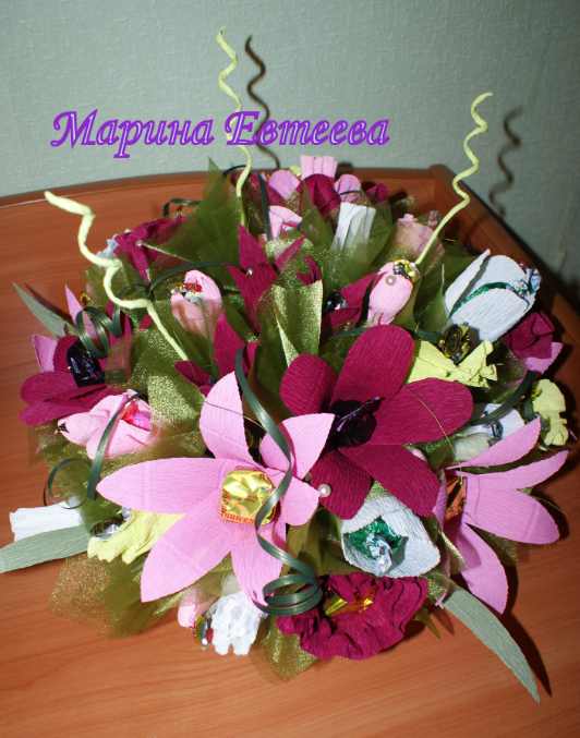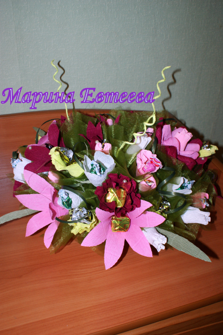 Симпатично, только можно чуть -чуть придать форму розовым цветам.Немного растянуть и придать им вид чаши: будет выглядеть естественнее и исчезнет небольшая диспропорция между длиной и шириной лепестка..