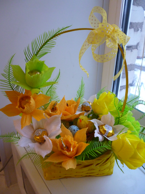 Букеты из конфет. Свитдизайн.Девочки,всем привет! Сделала сегодня пасхальную корзиночку для бабули. Правда до светлого праздника Пасхи ещё месяц,но в следующие выходные я уезжаю и на ТРИ недели оставляю своё рукоделие(как жить без него буду