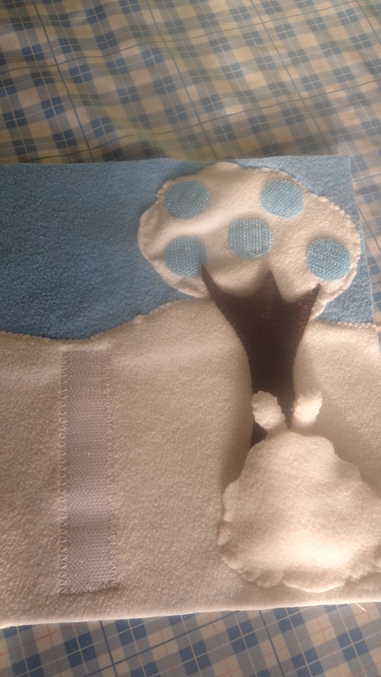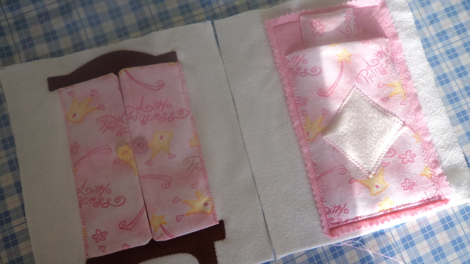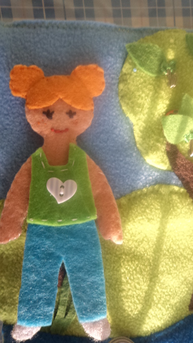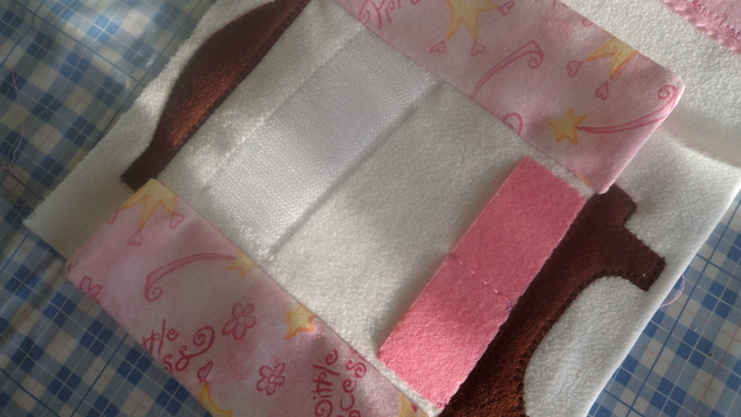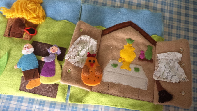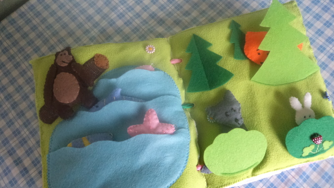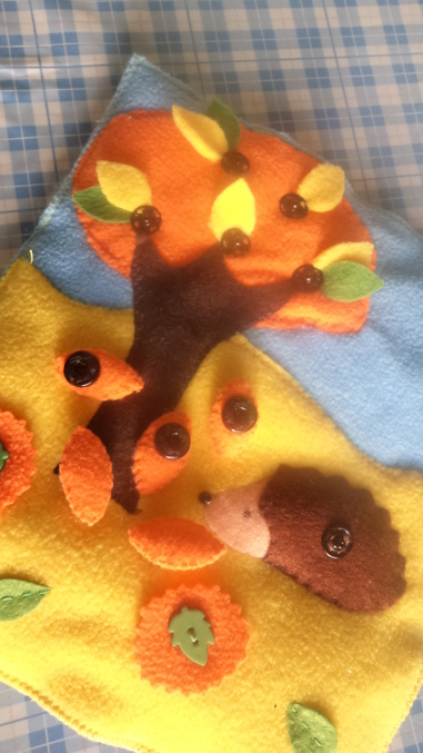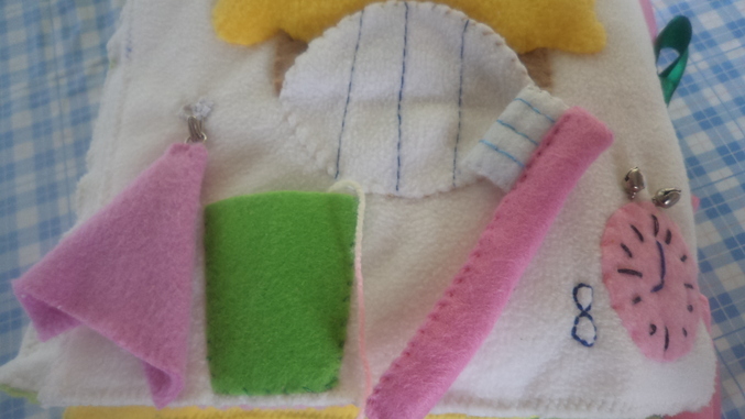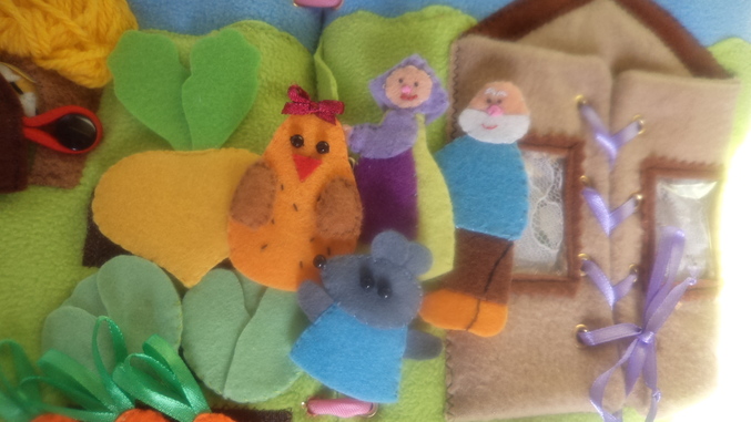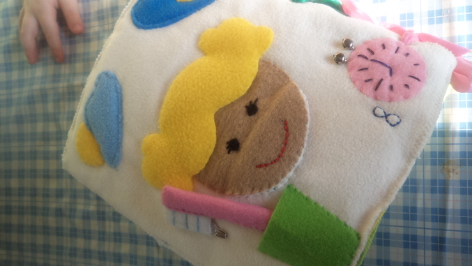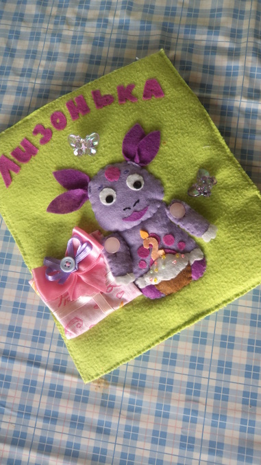 Обложка.Подарок открывается в него можно положить маленький сюрпризик или конфетку.(закрываются на липучку)Ручки на пуговках,снимаются сразу тренируем мелкую моторику....