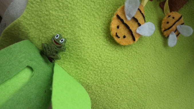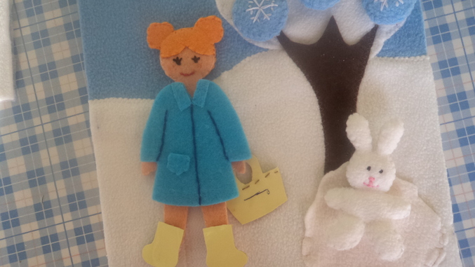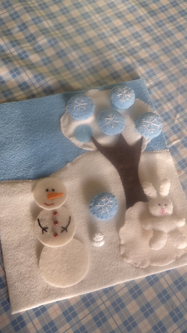 Зима...Выпал снег(снежки на липучках),за кустом спрятался зайка(Соня решила ,что это кровать,и укладывала его туда спать)